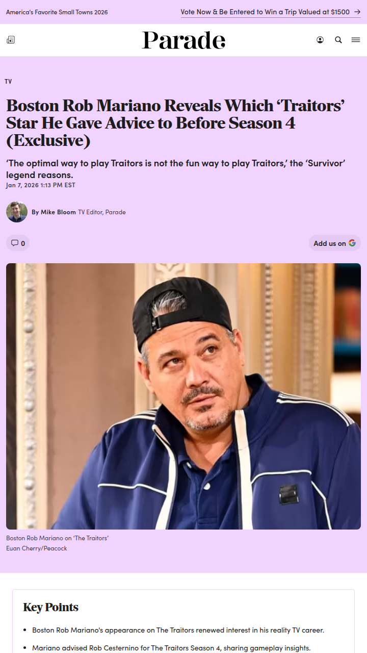 Judith Nelson+FollowTraitors Season 4: Boston Rob’s secret adviceBoston Rob Mariano didn’t just leave his mark on The Traitors—he’s now shaping the game from behind the scenes. Before Season 4 kicked off, Rob shared his personal playbook with fellow Survivor alum Rob Cesternino, blending strategy with showmanship. Rob admits the optimal way to win isn’t always the most entertaining, but he encouraged Cesternino to find that sweet spot between flying under the radar and making great TV. With Rob’s advice in his pocket, will Cesternino finally get his reality TV redemption? Let’s see if this Survivor alliance shakes up the new season! #Sports #TheTraitors #BostonRob00Share