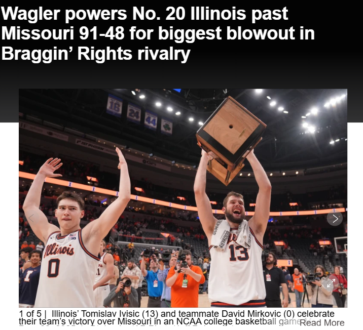 EchoingEagle+FollowIllinois dominates Missouri in historic rivalryIllinois fans just witnessed the most lopsided win ever in the Braggin’ Rights rivalry! Keaton Wagler, a freshman, lit up the scoreboard with five 3-pointers and 22 points, helping the Illini crush Missouri 91-48. The energy in St. Louis was electric as Illinois pulled away early and never looked back, even with key players like Stojakovic briefly sidelined. Missouri’s reserves played most of the second half, but the Illini’s defense and second-chance points made all the difference. How do you think this changes the rivalry going forward? #Sports #IllinoisBasketball #BragginRights00Share