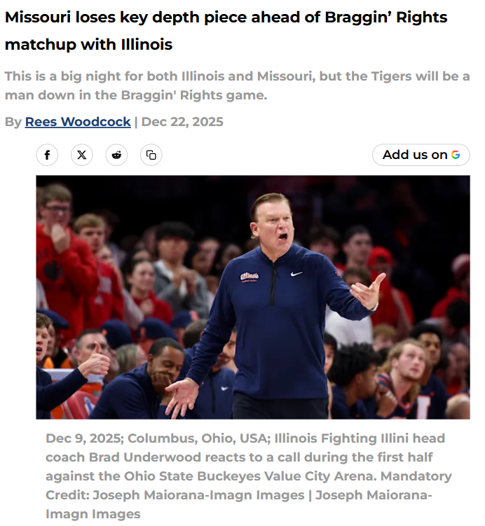 CrimsonChameleon+FollowIllinois crushes Mizzou in Braggin’ Rights blowoutThat was the roughest Braggin’ Rights game in recent memory—Missouri just suffered its worst loss to Illinois in the rivalry’s history, falling by a staggering 43 points. The Tigers couldn’t buy a bucket, struggled on defense, and got out-hustled on the boards, while Illinois was lights out from three. This wasn’t just a bad night; it’s the biggest blowout for any high-major team this season. Is this a sign of deeper issues for Mizzou, or just a one-off disaster? How do you think the Tigers can bounce back before SEC play? #Sports #BragginRights #Mizzou00Share