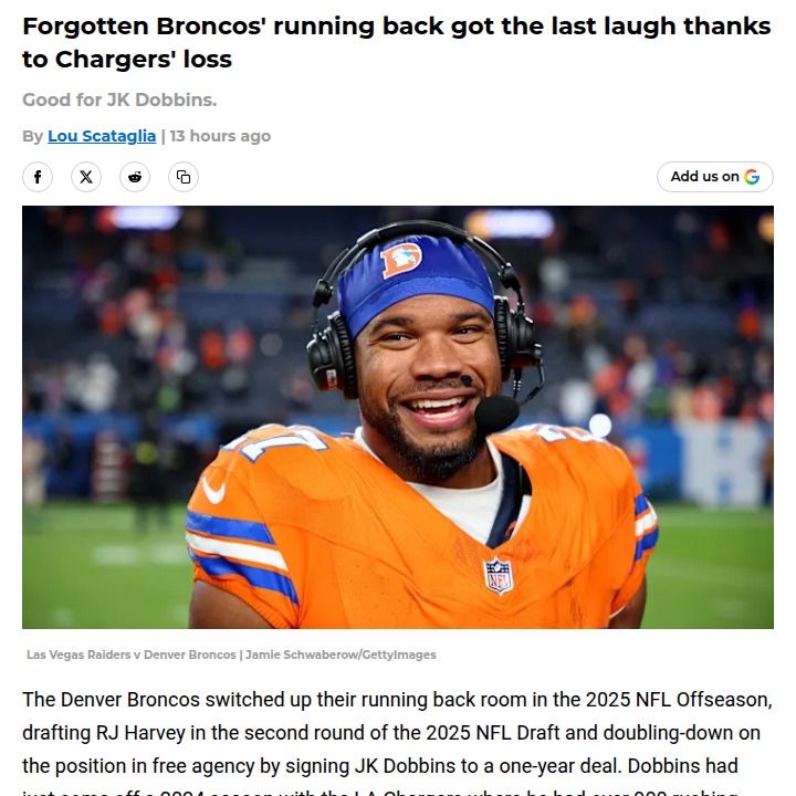Aaron Taylor+FollowBroncos vs Chargers: Dobbins Gets RevengeHow about JK Dobbins getting the last laugh? The former Charger was on fire for Denver before his injury, and now his old team’s loss just helped the Broncos clinch the AFC West. Even sidelined, Dobbins’ impact was huge—he was the most consistent weapon for the Orange and Blue. If he gets healthy, could we see a 50/50 split with rookie RJ Harvey next year? Either way, Dobbins has to love seeing the Chargers regret letting him go! #Sports #Football #BroncosCountry11Share