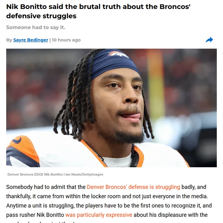 Chad Williams+FollowBroncos’ defense: What’s really going on?Nik Bonitto didn’t sugarcoat it—the Broncos’ defense just isn’t playing up to its own standards lately. Since the bye week, we’ve seen more missed tackles, miscommunication, and penalties than we’re used to from this group. Even Bonitto himself admitted he’s frustrated with his performance and the unit as a whole. It’s wild how quickly things shifted after such a strong start to the season. With the Chiefs coming up (and a third-string QB at that), is this the moment for Denver’s defense to bounce back, or are deeper issues at play? How are you feeling about this late-season slide? #Sports #Football #BroncosCountry02Share
