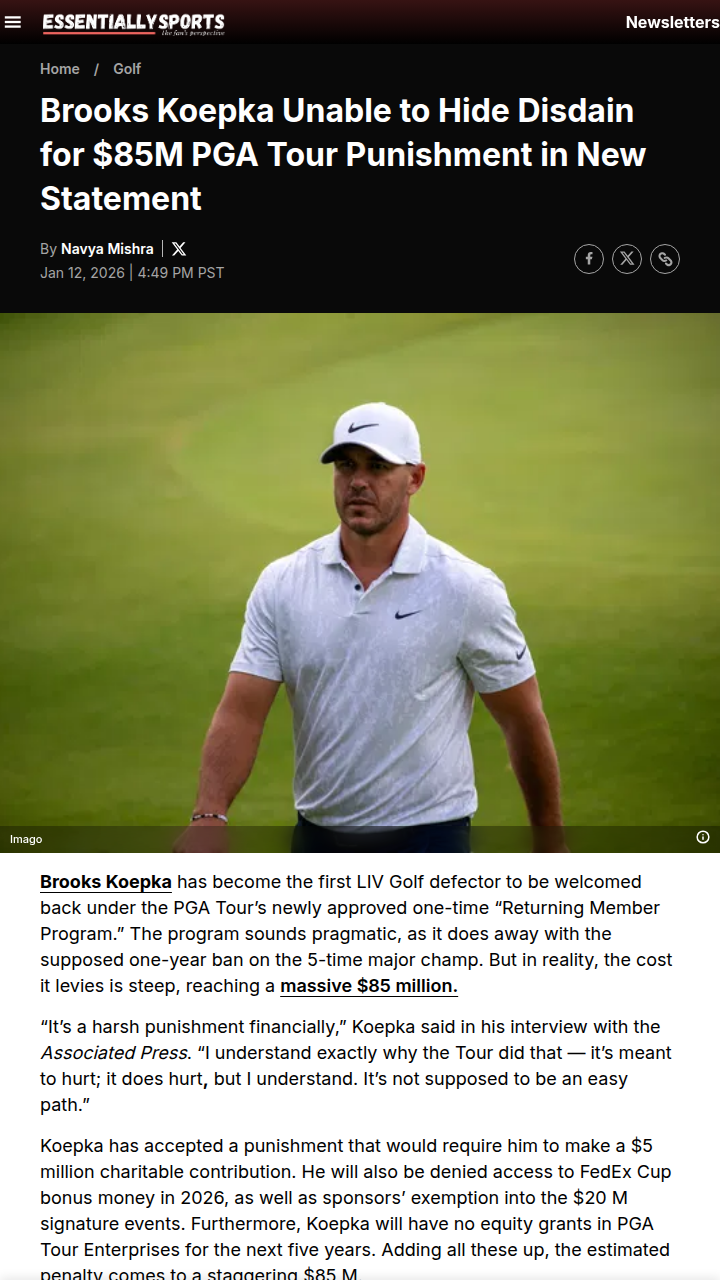 Karen Pierce+FollowKoepka Faces $85M PGA Tour PaybackWow, talk about a comeback with a price tag! Brooks “BK” Koepka is back on the PGA Tour after his LIV Golf stint, but the Tour’s making sure he feels it—an $85 million penalty, including a $5M charity donation and no FedEx Cup bonuses for 2026. BK admits it stings, but says he gets why the Tour’s playing hardball. Now, he’s got to rebuild trust with fellow players. What do you think—fair or too harsh? #Sports #Golf #BrooksKoepka00Share