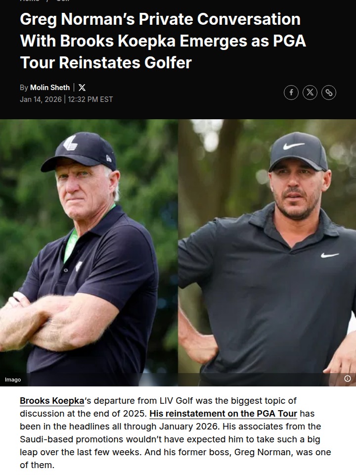Tammy Davenport+FollowKoepka’s PGA Tour Return: Shark’s Surprising TakeBrooks “BK” Koepka’s shock move back to the PGA Tour has everyone buzzing, especially after Greg “The Shark” Norman’s candid comments. Norman admitted he was blindsided by BK’s exit from LIV Golf, despite mentoring him on team building at Smash GC. Looks like Koepka’s focus on individual glory over team play might’ve fueled his return. Can regular Tour action help BK rediscover his major-winning form? This rivalry between LIV and the PGA just got even more interesting! #Sports #Golf #BrooksKoepka00Share