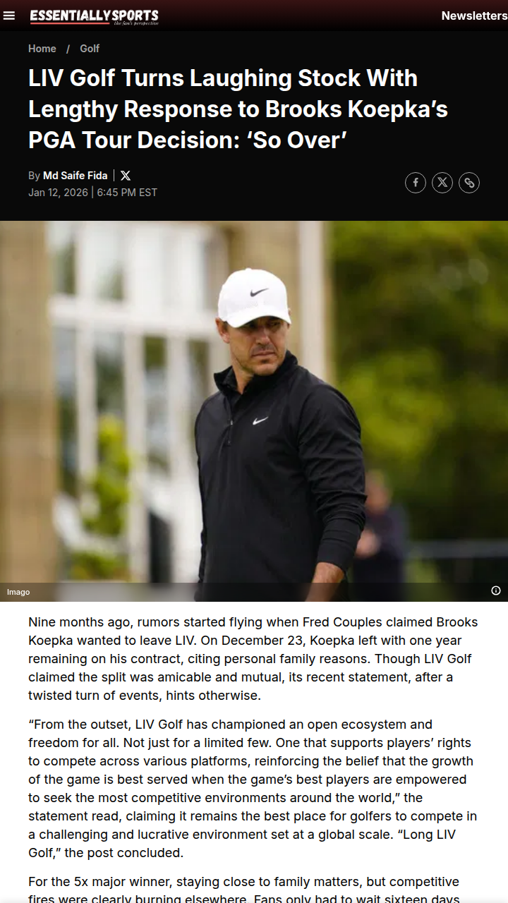 Tammy Davenport+FollowBrooksie’s PGA Tour Return: LIV’s ‘So Over’ MomentWow, Brooksie is heading back to the PGA Tour! After all the drama, King Koepka officially asked for his old spot and will tee it up at the Farmers Insurance Open in 2026. LIV Golf’s response? A long-winded statement about freedom and dreams, but fans aren’t buying it. The internet roasted LIV, with jokes like “Short LIV Golf” and “it’s so over.” Is this the end of the LIV vs. PGA rivalry? #Sports #Golf #BrooksKoepka00Share