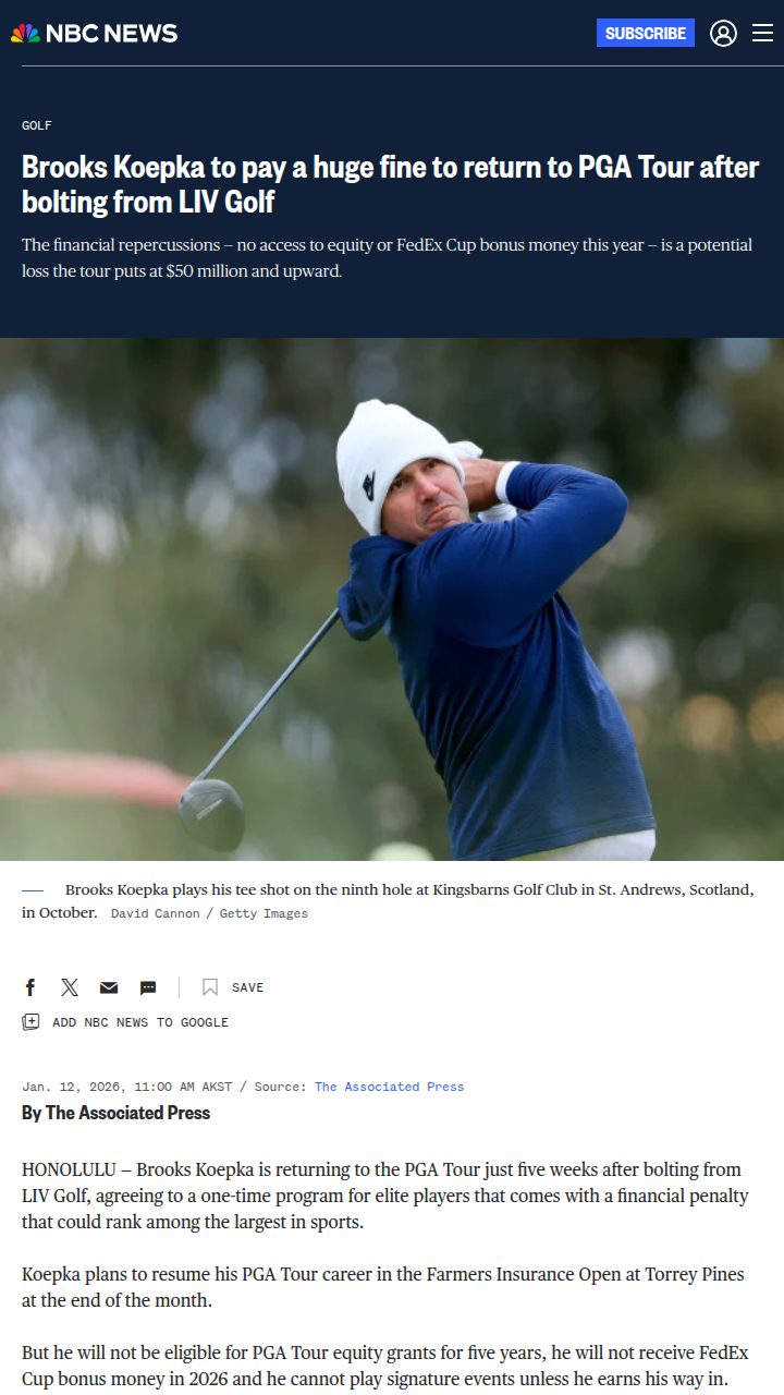 Karen Pierce+FollowKoepka’s Pricey PGA Comeback: Worth It?Brooks “BK” Koepka is back on the PGA Tour after his LIV Golf detour, but it’s costing him—a $5 million charity fine and missing out on up to $85 million in equity and bonuses. The Tour’s new one-time “Returning Member Program” only lets recent major champs like Koepka back in, and not everyone’s thrilled. Will this move reignite old rivalries or just stir more controversy? #Sports #Golf #BrooksKoepka00Share