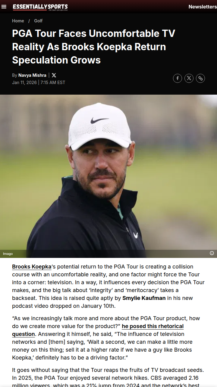 Heather Garcia+FollowKoepka’s Comeback: TV Money vs. Merit?Golf fans, what’s your take on the Brooks Koepka return buzz? With “Smylie” Kaufman dropping truth bombs on his podcast, it’s clear the PGA Tour’s TV partners are hungry for star power—think Koepka, not just rookies grinding for a spot. With the Tour shrinking events and fields, does letting Brooks back in mean one less spot for a deserving up-and-comer? Or is TV money king? This dilemma could put Tiger and Rolapp in a real bind. Let’s hear your thoughts! #Sports #Golf #BrooksKoepka00Share