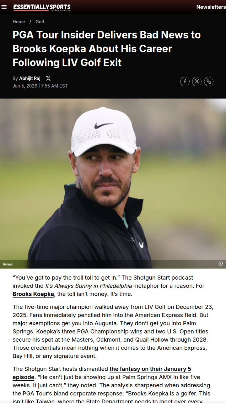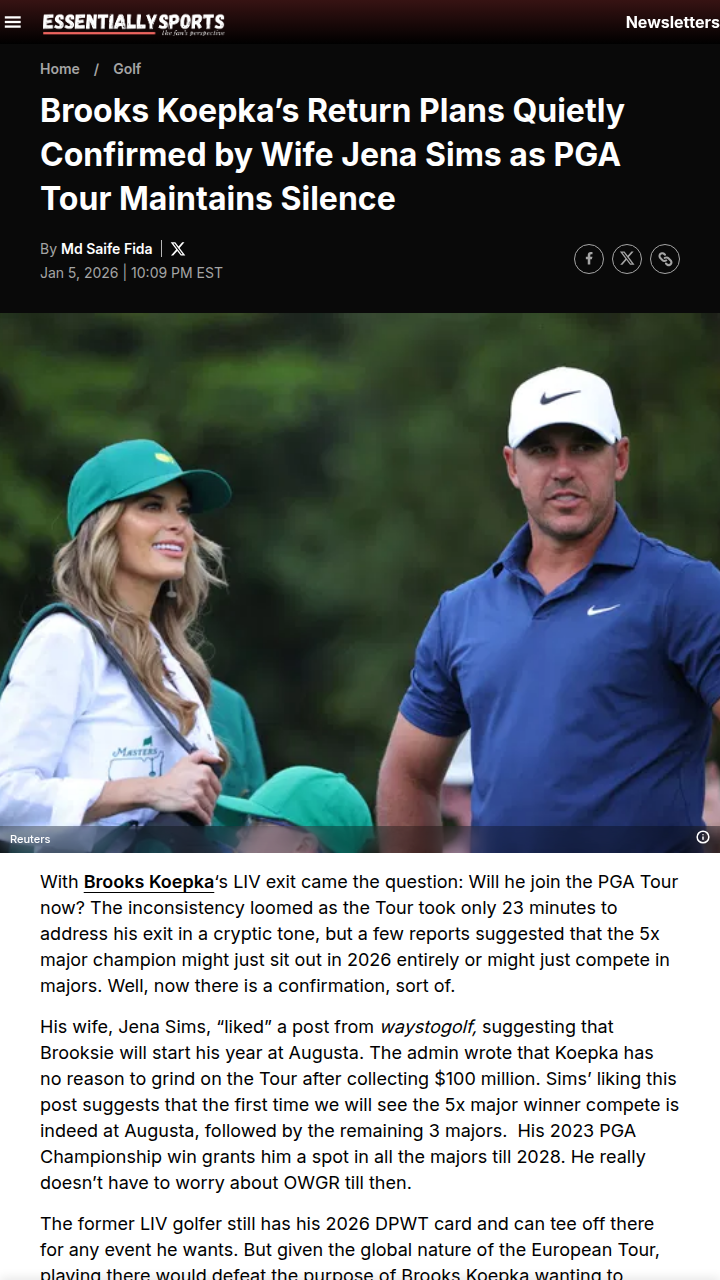 Gabriella Gonzalez+FollowBrooksie’s Augusta Comeback? Jena Drops a HintLooks like Brooksie is plotting a major-only schedule for 2026! After his LIV exit, the PGA Tour’s silence left us all guessing, but Jena Sims just liked a post hinting Koepka’s first tee-up will be at Augusta. With his 5x major champ status, he’s set for all the big ones through 2028. But the real drama? Will the Tour let him back without a fight, or will Brooks face the same hurdles as the rest? Golf’s meritocracy is on the line! #Sports #Golf #BrooksKoepka00Share