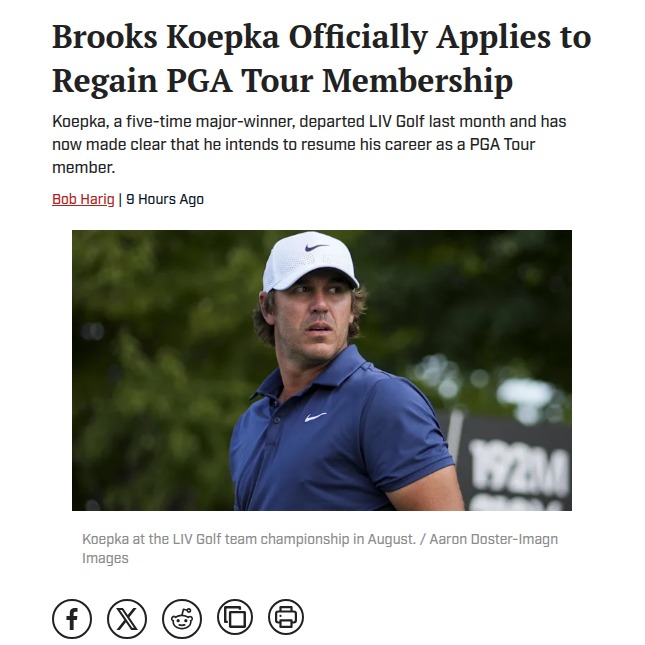 Michael Singh+FollowKoepka Eyes PGA Comeback After LIV SplitBig news in the golf world: Brooks “BK” Koepka is officially seeking a return to the PGA Tour after his high-profile exit from LIV Golf. After making history as the first LIV player to win a major, Koepka’s move has fans buzzing about a potential rekindling of his rivalry with the PGA’s best. Will the Tour welcome him back, and how soon could we see BK tee it up stateside again? #Sports #Golf #BrooksKoepka00Share