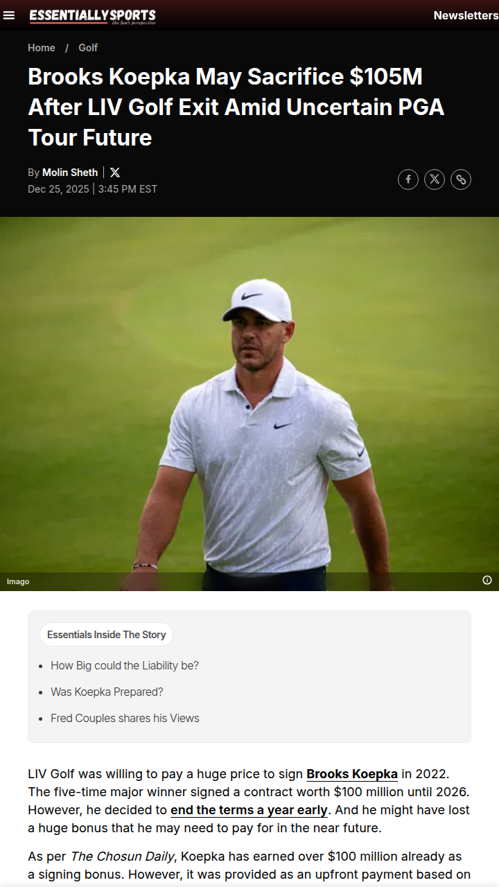 frank59+FollowKoepka’s $105M Gamble: LIV Exit DramaBrooks “BK” Koepka just made one of the boldest moves in golf, walking away from his $100M+ LIV Golf contract a year early. Now, the rumor mill is buzzing: will he have to pay back that massive signing bonus? Some say King Koepka’s eyeing a PGA Tour comeback, with Fred Couples hinting at it months ago. If the Tour welcomes him back, could the loss be worth it for the thrill of real competition? What’s your take on Koepka’s high-stakes play? #Sports #Golf #BrooksKoepka10Share