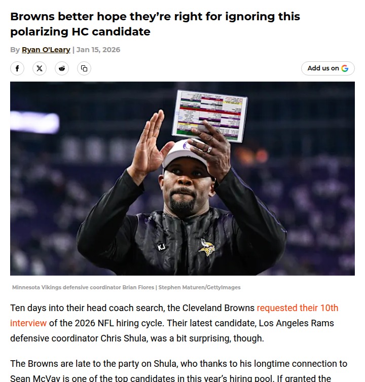 Christopher Hughes+FollowBrowns’ coaching search leaves fans dividedCleveland’s head coach hunt is turning heads—eight of their ten interview requests are for coaches with zero NFL head coaching experience, and most are offense-focused. Yet, the Browns just now requested to interview Chris Shula, a hot defensive coordinator everyone else is after, while seemingly ignoring proven names like Brian Flores. With the defense already a strength, some fans are baffled by the team’s late interest in Shula and lack of urgency for Flores. Is Cleveland missing out on the right leader, or are they betting big on a fresh approach? Let’s hear your take: is this the right move or a risky gamble? #Sports #Football #Browns00Share