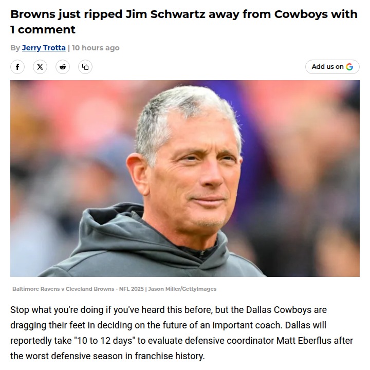 glen25+FollowBrowns Block Cowboys’ Shot at SchwartzLooks like the Dawg Pound just threw a wrench in Jerry World’s plans! After the Cowboys’ D had its worst season ever, fans were buzzing about bringing in Jim Schwartz as DC. But Browns owner Jimmy Haslam made it clear: Schwartz isn’t going anywhere, at least not without a fight. Even Denzel Ward is vouching for him to take over as head coach. Could Dallas still find a loophole, or is this rivalry heating up off the field? #Sports #Football #Browns100Share