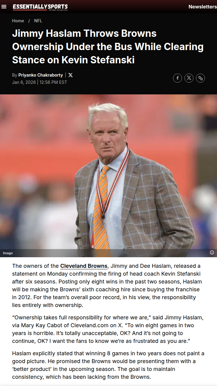 John Camacho+FollowBrowns fans react: Haslam owns up, Stefanski outJimmy Haslam just admitted what many Cleveland Browns fans have been saying for years: ownership is taking the blame for the team’s constant struggles. After firing head coach Kevin Stefanski, Haslam promised a “better product” and said eight wins in two years is “totally unacceptable.” The Browns have cycled through coaches and still can’t shake their fourth-place curse. With a top draft pick coming up and GM Andrew Berry staying on, do you think this shakeup will finally turn things around, or is it just more of the same? #Sports #Football #Browns00Share
