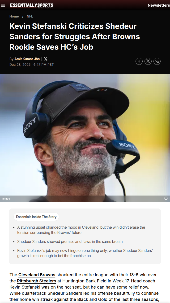 Jay Williams+FollowBrowns rookie Sanders shakes up Steelers rivalryCleveland just pulled off a gritty win over Pittsburgh, but what’s really got people talking is rookie QB Shedeur Sanders’ wild ride. Despite keeping the Browns’ home streak alive, Sanders had two tough interceptions—one not his fault, the other a real head-scratcher that even had his dad, Deion Sanders, shaking his head. Coach Stefanski didn’t sugarcoat it: there’s work to do, but he’s sticking with his young QB. This win might’ve saved Stefanski’s job, but is Sanders’ development the key to the Browns’ future? Browns fans, how do you feel about the rookie’s growing pains? #Sports #Football #Browns00Share