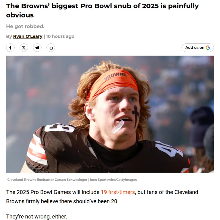 Chad Williams+FollowCleveland Browns rookie snubbed from Pro BowlCarson Schwesinger’s rookie season with the Browns has been nothing short of electric, yet he’s missing from the 2025 Pro Bowl roster. Despite racking up 147 tackles, 11 tackles for loss, and 2 interceptions, Schwesinger was passed over for players with less impressive stats. Browns fans are understandably frustrated—especially since some picks seem more about team records than individual performance. When a breakout rookie gets overlooked like this, it really makes you wonder: Should Pro Bowl nods be about wins, or the players who truly stand out on the field? #Sports #Football #Browns00Share