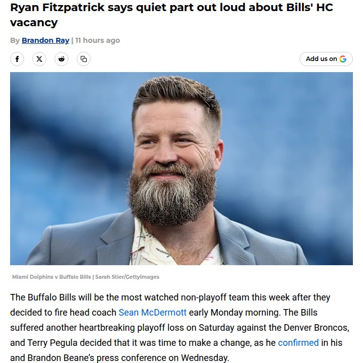 Christopher Hughes+FollowFitzpatrick’s take: Bills need a veteran HCRyan Fitzpatrick isn’t holding back—he thinks the Bills’ next head coach shouldn’t be a young, “cool” hire, but a seasoned veteran who can push Josh Allen to the next level. With Buffalo’s coaching search heating up after McDermott’s firing, names like Brian Daboll and Anthony Lynn (both with head coaching experience) are in the mix, alongside some first-timers. Fitzpatrick argues that Allen needs a leader, not a buddy. Do you agree the Bills should go with experience over fresh ideas, or is it time for a bold new direction? #Sports #Football #BuffaloBills00Share