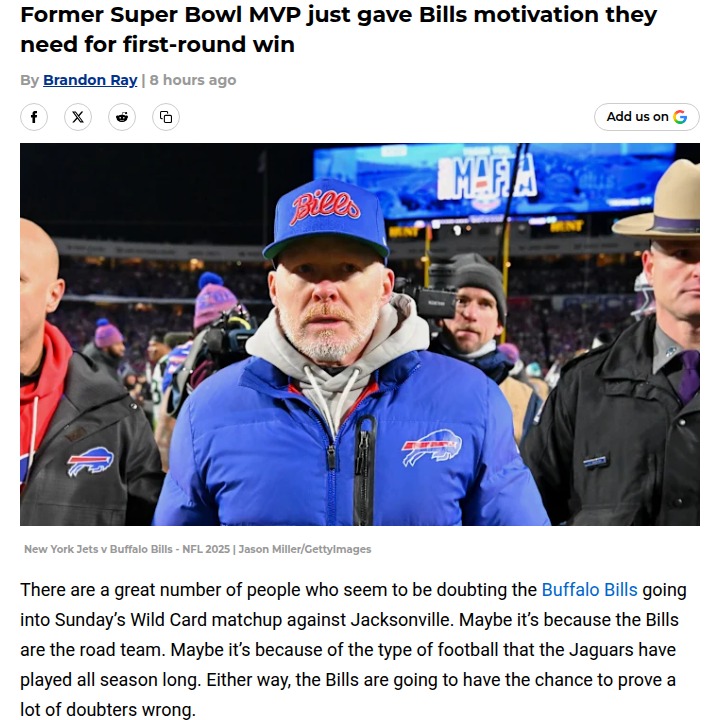 Michael Pitts+FollowBills face doubters in Jacksonville showdownFormer Super Bowl MVP Phil Simms is picking the Jaguars over the Bills in this weekend’s Wild Card matchup, calling Jacksonville Buffalo’s toughest playoff test. Simms described the Jags as “big, powerful, tough, hard-coached,” but Buffalo’s playoff experience and Josh Allen’s electric postseason record can’t be ignored. Allen has racked up 32 touchdowns to just 4 interceptions in 13 playoff games. The real question: can the rest of the Bills step up? With playmakers like James Cook and Joey Bosa ready to shine, this game could silence a lot of critics. Who do you think has the edge—Jacksonville’s grit or Buffalo’s playoff pedigree? #Sports #Football #BuffaloBills10Share