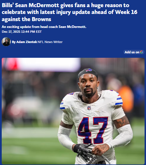 Christopher Hughes+FollowBuffalo Bills get a major health boost for Week 16Bills fans, this is the kind of update you want before a crucial game. Most of the roster is trending healthy as Buffalo preps for the Browns, with key defender Christian Benford set to practice after his toe injury. His return could be a game-changer for the defense. On offense, there’s more good news: speedy receiver Mecole Hardman’s practice window is open, giving Josh Allen another weapon. While kicker Matt Prater and DT Jordan Phillips are out, the team’s overall health is the best it’s been in weeks. With the playoffs in sight, could this be the momentum shift Buffalo needs? #Sports #Football #BuffaloBills10Share