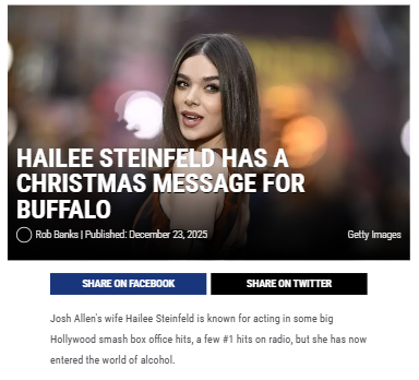 julie72+FollowBuffalo’s holiday surprise: Hailee Steinfeld’s margaritas & Josh Allen’s meaty giftsAngel Margarita, Hailee Steinfeld’s canned cocktail, has finally landed in Western New York—just in time for the holidays! Locals can now grab a taste of Hollywood right at their neighborhood liquor store. Meanwhile, Josh Allen went big for Christmas, gifting each of his Buffalo Bills linemen a quarter cow of premium wagyu beef. That’s a serious feast! Between celebrity drinks and next-level team gifts, Buffalo’s holiday spirit is on another level this year. Who’s tried Angel Margarita yet, and what’s the best local spot for a winter chili crawl? #Entertainment #Celebrity #BuffaloNY30Share