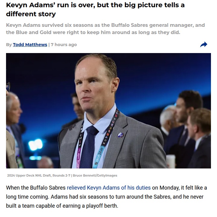 Sherri West+FollowSabres shake up: What’s next after Adams?Buffalo’s hockey scene just got a major jolt—Kevyn Adams is out as Sabres GM after years of near-misses and tough calls. Adams built a young, exciting core and made bold trades, but the playoff drought dragged on, and some big contract bets didn’t pay off. Fans saw hope, especially in 2023, but recent trades and a brutal losing streak sealed his fate. Now, with promising talent still on the roster, the big question is: will a new direction finally break the curse? What moves do you think the Sabres need to make to get over the hump? #Sports #IceHockey #BuffaloSabres00Share