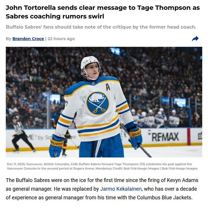 Bryce Clark+FollowSabres’ leadership put to the test after GM shakeupBig changes in Buffalo: with a new GM at the helm, the Sabres’ locker room is under the microscope. ESPN’s John Tortorella didn’t hold back, calling out Tage Thompson to step up and lead by example after a sluggish home return. Despite a recent win streak, the Sabres looked flat, raising questions about accountability on the ice. While coaching rumors swirl, Tortorella insists the players need to take charge before any bench changes happen. Do you think a new coach or a roster shakeup is what Buffalo really needs right now? #Sports #IceHockey #BuffaloSabres00Share