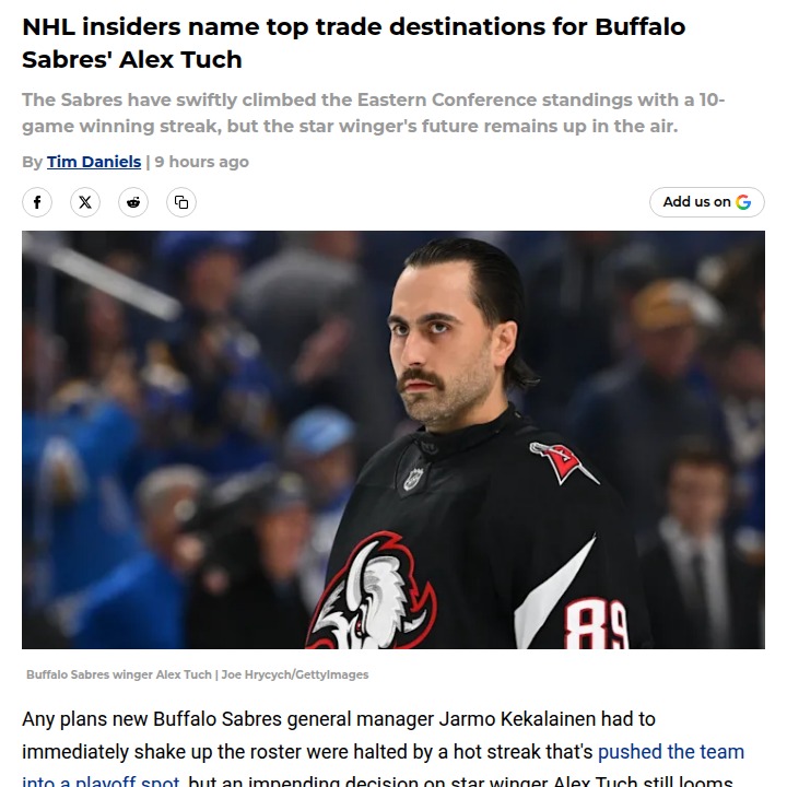 stacy28+FollowBuffalo faces tough call on Alex TuchBuffalo’s playoff surge has put the spotlight on Alex Tuch’s future with the Sabres. Tuch wants a long-term deal—reportedly $10.5 million a year—but management seems hesitant to commit that much. If the two sides can’t find common ground, Tuch could become one of the hottest names on the NHL trade market, with teams like the Rangers and Kings already being floated as top destinations. Would you lock in Tuch for eight years, or is it smarter for Buffalo to trade him while his value is sky-high? Curious to hear what Sabres fans think about this crossroads. #Sports #IceHockey #BuffaloSabres00Share