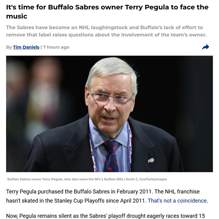 Phillip Scott+FollowBuffalo fans deserve answers from PegulaFourteen years without playoff hockey and still no word from Terry Pegula—Buffalo’s patience is running out. After another ugly loss and a season slipping away, Sabres fans are left wondering why there’s zero urgency from ownership or the front office. The KeyBank Center keeps filling up, but the team’s direction feels stuck. If Pegula believes in his management and coaching staff, he owes the city an explanation. Buffalo’s hockey community has stuck by this team through thick and thin—shouldn’t the owner show the same accountability? What changes do you think are needed to finally break the drought? #Sports #IceHockey #BuffaloSabres00Share