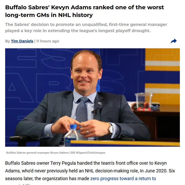 stacy28+FollowBuffalo Sabres fans brace for big changesAfter years of frustration, Buffalo Sabres fans might finally see a shakeup in the front office. Kevyn Adams, who was handed the GM job with no prior NHL management experience, has just been ranked among the worst long-term GMs in league history. The Sabres are still stuck at the bottom of the Eastern Conference, and rumors are swirling that Adams’ time could be up soon. With the team’s playoff drought now at 14 years, a fresh start could be exactly what Buffalo needs. What do you think—should the Sabres clean house and start over? #Sports #IceHockey #BuffaloSabres21Share