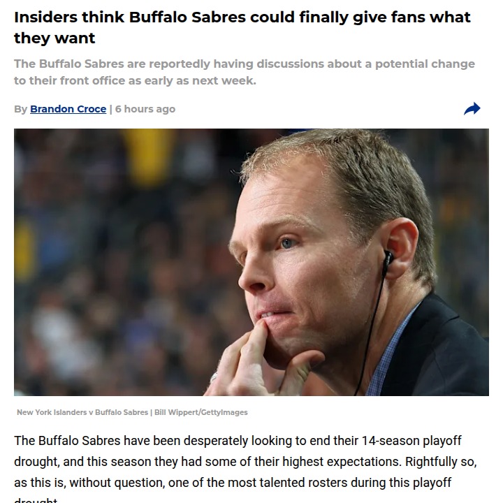 Jason Dawson+FollowSabres shakeup: Could a new GM finally end the drought?Buffalo fans might finally see the change they've been waiting for. After another tough season and a record playoff drought, the Sabres are reportedly considering replacing GM Kevyn Adams. Despite some bold moves and a talented roster, the team is still stuck at the bottom of the standings. Ownership seems ready to try a new approach to build a winning team and bring playoff hockey back to Buffalo. What do you think—should the Sabres make a front office change, or stick with Adams a little longer? #Sports #IceHockey #BuffaloSabres00Share