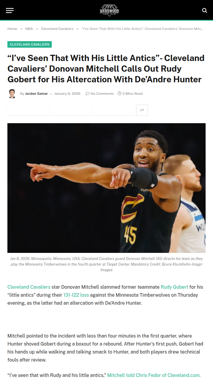 Theresa Boyd+FollowCavaliers vs Timberwolves: Mitchell calls out GobertDonovan Mitchell didn’t hold back after the Cavaliers’ tough loss to the Timberwolves, calling out Rudy Gobert for his “little antics” during a heated moment with De’Andre Hunter. Both players got technicals after a first-quarter scuffle, and Mitchell made it clear he’s seen this side of Gobert before. The Cavs struggled to keep up as Minnesota shot lights out, especially in the third quarter. Mitchell says the team can’t keep digging themselves into holes and expects more consistency. What do you think—are the Cavs missing something, or was this just a hot Timberwolves night? #Sports #Basketball #Cavaliers00Share