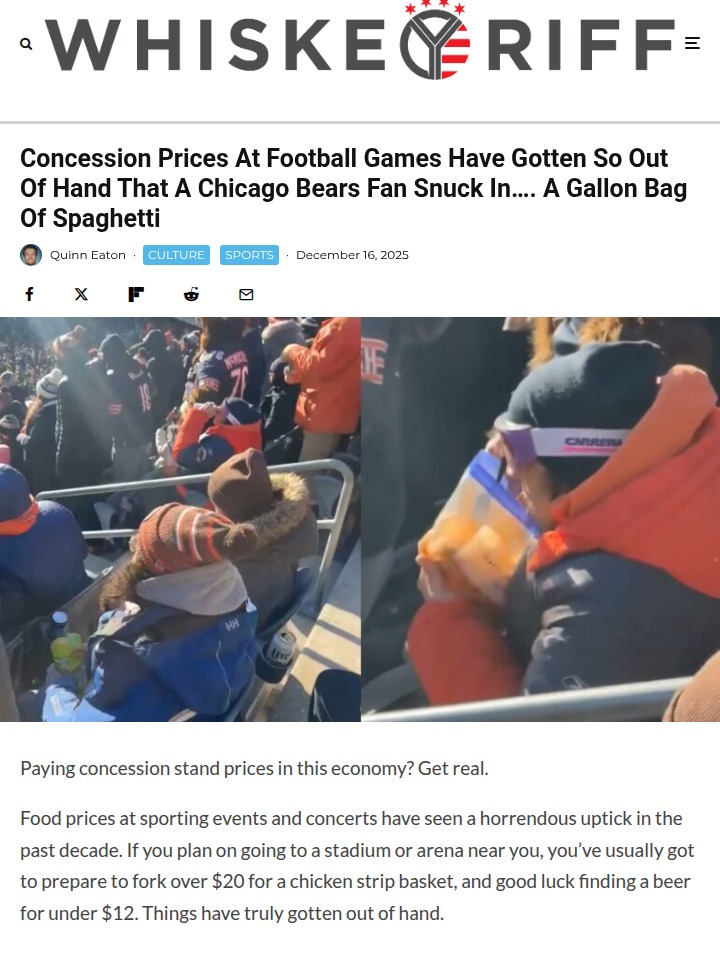 Jenna Gonzales+FollowChicago Bears fan’s spaghetti move sparks debateConcession prices at Bears games have gotten so wild that one creative fan decided to skip the $30 chicken sandwich and bring in a full gallon bag of homemade spaghetti instead! While the Bears dominated the Browns, this bundled-up fan was living their best life in the stands, digging into cold pasta and dodging the so-called “stadium tax.” It’s hilarious, but also says a lot about how far people will go to avoid outrageous food prices at events. Would you ever sneak in your own meal to a game? What’s your go-to stadium food hack? #Sports #ChicagoBears #StadiumTax00Share