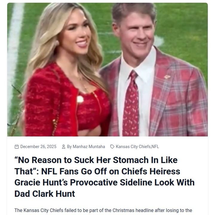Aaron Taylor+FollowKansas City Chiefs fans debate Gracie Hunt’s sideline momentGracie Hunt’s bold red sideline look at the Chiefs game set social media on fire—not for her outfit, but for the viral moment she sucked in her stomach during a family photo with her dad, Clark Hunt. Despite having visible abs, fans were quick to call out the move as awkward and unnecessary, sparking a wave of commentary about body image and public scrutiny. While the Chiefs missed the playoffs, this sideline drama has everyone talking: Is the pressure to look perfect on camera just too much? What do you think about the reaction? #Sports #Football #ChiefsKingdom10Share