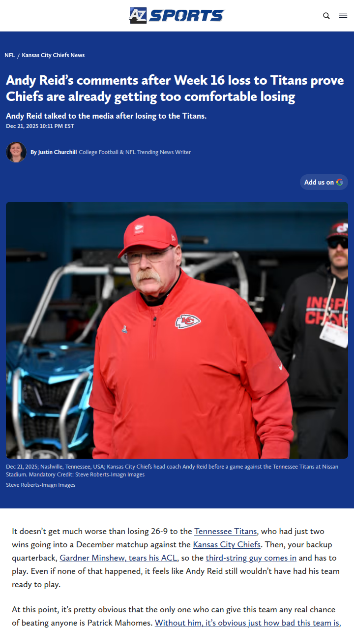 phughes+FollowChiefs fans: Is Kansas City getting too comfortable with losing?Losing 26-9 to the Titans—who only had two wins—felt like a gut punch for Kansas City. With backup QB Gardner Minshew out and the third-stringer forced in, the Chiefs looked lost without Mahomes. Andy Reid’s postgame comments sounded oddly accepting, almost like he’s settling for defeat. That’s not the mindset we’re used to from a team that’s dominated for years. Are the Chiefs slipping into a losing culture, or is this just a rough patch? Curious to hear what everyone thinks—should we be worried about the direction this team is heading? #Sports #Football #ChiefsKingdom11Share