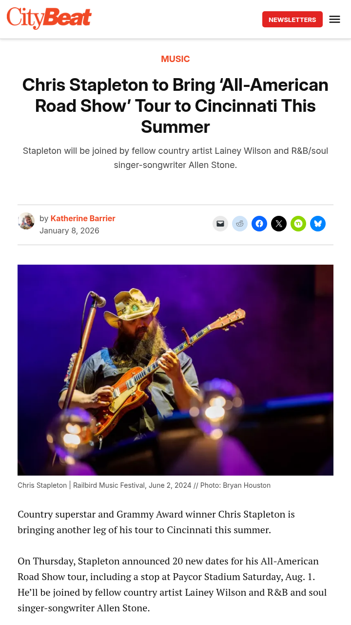 sfrazier+FollowChris Stapleton’s Cincinnati summer show: Who’s in?Chris Stapleton is set to light up Cincinnati this summer with his All-American Road Show, bringing Lainey Wilson and Allen Stone along for the ride. The concert lands at Paycor Stadium on August 1, and tickets are expected to go fast—especially with Stapleton’s recent Grammy buzz and new music releases. Fan club members and Citi cardholders get first dibs on tickets before the general sale. If you’re a country or soul fan, this is shaping up to be a must-see event. Who’s planning to grab tickets, and what’s your favorite Stapleton song to hear live? #Entertainment #Music #ChrisStapleton00Share