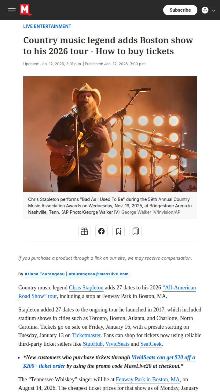 James Garner+FollowChris Stapleton Adds Boston Date! 🎤Chris Stapleton just dropped a Boston Fenway Park show for his 2026 tour and fans are losing it over ticket prices! The real drama? People are debating if he’s cashing in too hard—$300+ for nosebleeds?! Plus, with him up for four Grammys, some are saying this tour is all about the awards hype. Is this the ultimate flex or just smart timing? #Entertainment #Music #ChrisStapleton00Share