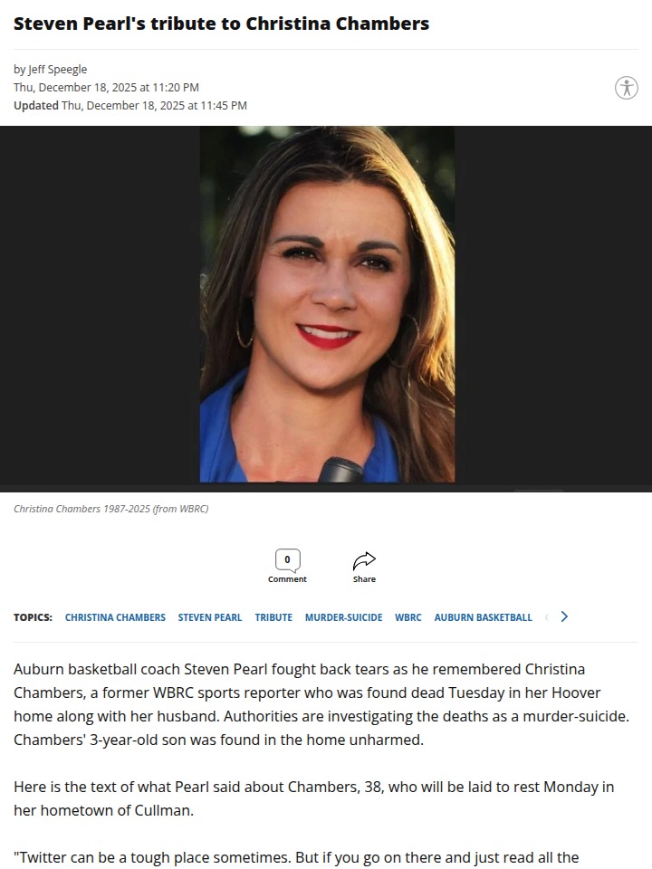 John Camacho+FollowRemembering Christina Chambers’ impact on AlabamaLosing Christina Chambers has left a huge hole in Alabama’s sports community. Auburn’s Steven Pearl described her as someone who brought light and kindness wherever she went—qualities that made her stand out not just as a reporter, but as a person. Chambers covered everything from high school football to Auburn’s historic Final Four run, always with genuine excitement and professionalism. Her tragic passing, along with her husband, leaves behind their young son, Constantine. The Auburn family is rallying to support him, and Pearl’s heartfelt words remind us how much Christina meant to so many. How do you think local sports coverage will feel without her presence? #Sports #Football #ChristinaChambers00Share