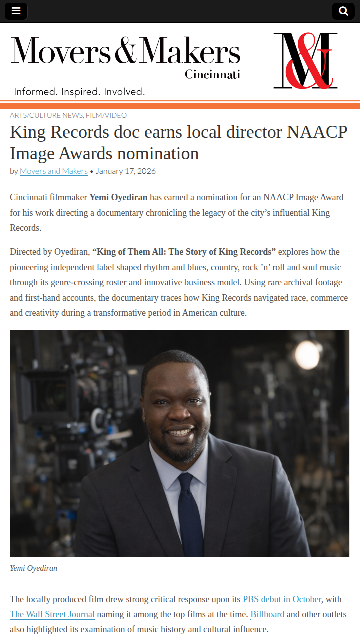 esaunders+FollowCincinnati’s King Records story gets national spotlightKing Records, the Cincinnati label that helped shape American music, is back in the national conversation thanks to local filmmaker Yemi Oyediran. His documentary, “King of Them All,” just earned an NAACP Image Award nomination for its deep dive into the label’s legacy—mixing rare footage and firsthand stories to show how King Records broke barriers in music and business. The film’s PBS debut drew rave reviews, and now it’s up against big names like Questlove. It’s wild to see a Cincinnati story getting this kind of recognition! Have you watched it yet? What’s your favorite King Records artist or song? #Entertainment #Movies #Cincinnati00Share