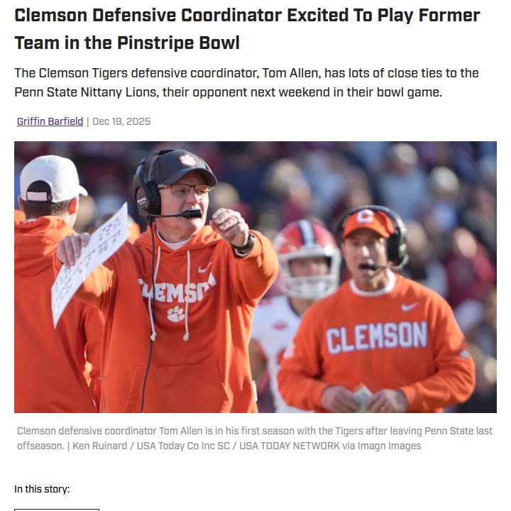 Jeffrey Armstrong+FollowTom Allen Faces Old Squad in Pinstripe BowlHow’s this for a storyline? Clemson’s new D-coordinator, Tom Allen, is set to call plays against his old crew, the Nittany Lions, in the Pinstripe Bowl at Yankee Stadium. Last year, Allen helped lead Penn State to the Natty, but now he’s got to outsmart his former players and coaching buddies. Can Allen’s Tigers defense shut down Penn State’s rising QB, Grunkemeyer, who he used to coach on scout team? This reunion is packed with emotion and insider chess moves! #Sports #Football #ClemsonTigers00Share