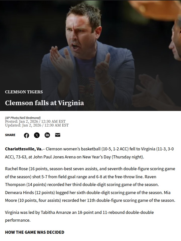 Ryan Lopez+FollowClemson’s late surge falls short at VirginiaClemson women’s basketball put up a fierce fight in Charlottesville, nearly erasing a double-digit deficit with an 11-0 run late in the fourth quarter. Despite standout performances from Rachel Rose (16 points, 7 assists) and teammates Raven Thompson, Demeara Hinds, and Mia Moore, the Tigers couldn’t overcome Virginia’s strong finish, falling 73-63. Tabitha Amanze led the Cavaliers with a double-double. This marks Clemson’s second ACC loss, but the team showed real grit on the road. Next up: a big test against Miami. What do you think Clemson needs to turn these close games into wins? #Sports #Basketball #ClemsonTigers00Share
