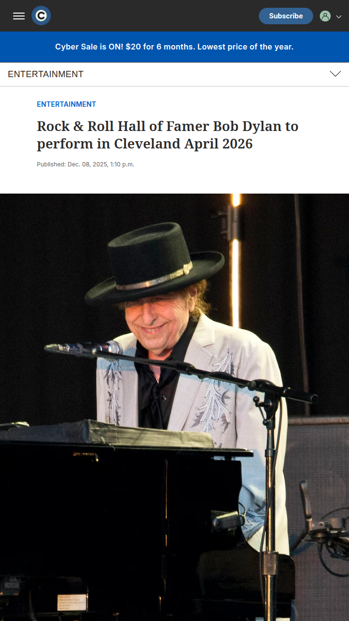 Suzanne Glover+FollowBob Dylan returns to Cleveland in 2026Bob Dylan is bringing his legendary sound back to Cleveland! The Rock & Roll Hall of Famer will hit the KeyBank State Theatre on April 10, 2026, as part of his “Rough & Rowdy Ways” tour. Fans can snag tickets starting December 12 at 10 a.m. via Playhousesquare.org. Whether you’ve seen Dylan live before or this would be your first time, this is a rare chance to catch a music icon in action right here in Northeast Ohio. Who’s planning to go, and what’s your favorite Dylan song to hear live? #Entertainment #Music #Cleveland10Share