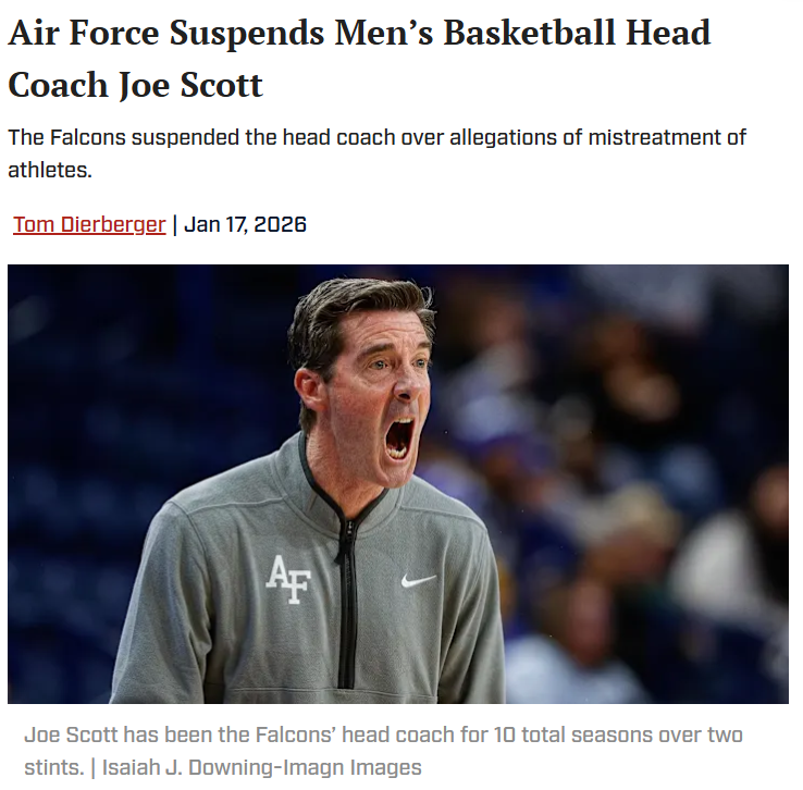 CrimsonChameleon+FollowAir Force basketball coach suspended amid controversyLongtime Air Force men’s basketball coach Joe Scott has been suspended indefinitely after allegations of mistreatment toward players surfaced. This shakeup comes as the Falcons continue to struggle on the court, not having finished above .500 in over a decade. Assistant coach Jon Jordan is stepping in for now, but with Scott’s legacy—including a rare NCAA tournament appearance—this move has fans and alumni buzzing. How do you think this leadership change will impact the team’s culture and future? Is it time for a fresh start at Air Force, or does Scott deserve another shot? #Sports #AirForceBasketball #CollegeHoops00Share