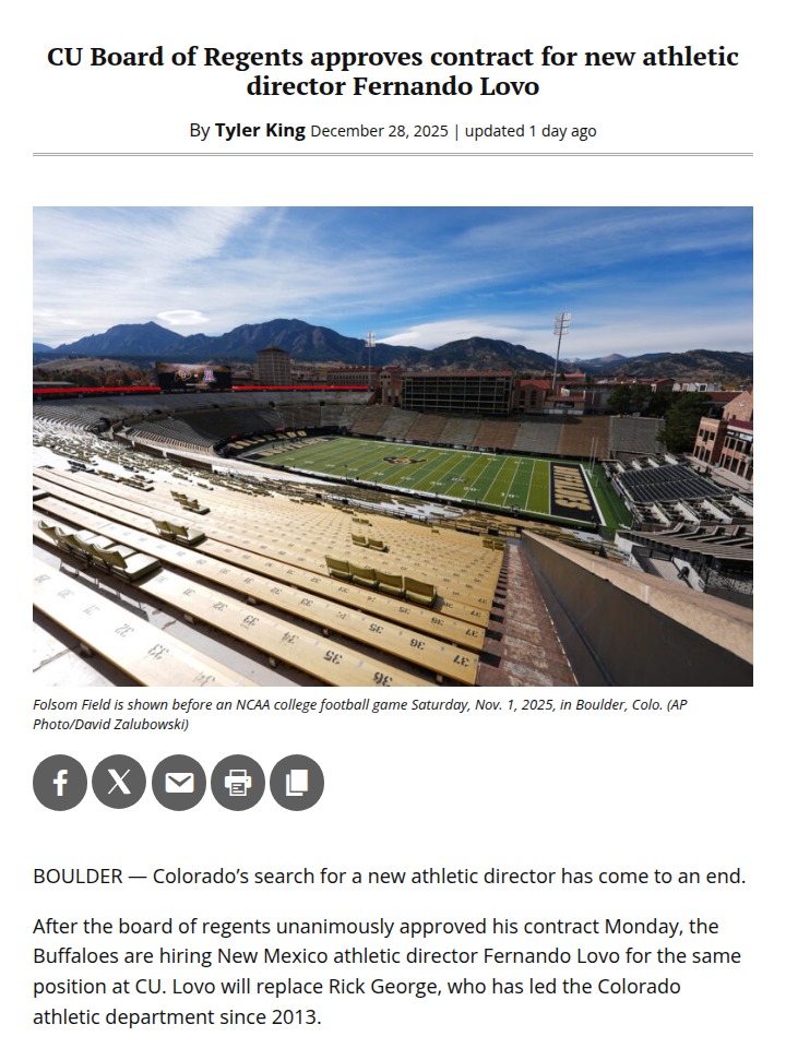 jharvey+FollowBig changes ahead for CU athleticsFernando Lovo is stepping in as CU Boulder’s new athletic director, and he’s making history with a $1.2 million annual contract—the highest ever for the role at CU. Lovo’s track record is impressive: in just one year at New Mexico, he boosted football wins, packed stadiums, and led record fundraising. With his experience at major programs like Texas and Ohio State, Boulder’s sports scene could be in for a serious upgrade. What do you hope Lovo tackles first to take CU athletics to the next level? #Sports #CUBoulder #CollegeSports10Share