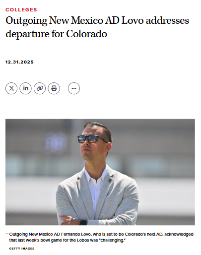AmberAbyss+FollowBig changes shake up New Mexico Lobo athleticsFernando Lovo’s sudden move from New Mexico to Colorado as athletic director is hitting Lobo fans hard, especially after he was just at the bowl game days before the news broke. Lovo admits the timing isn’t great and gets why the community feels frustrated or even betrayed. He says his focus was always on building pride around Lobo athletics, but now Ryan Berryman steps in as interim AD. Meanwhile, Lovo faces a tough challenge in Colorado: holding Deion Sanders accountable after a rocky football season. What do you think this leadership shakeup means for both schools? #Sports #LoboAthletics #CollegeSports00Share