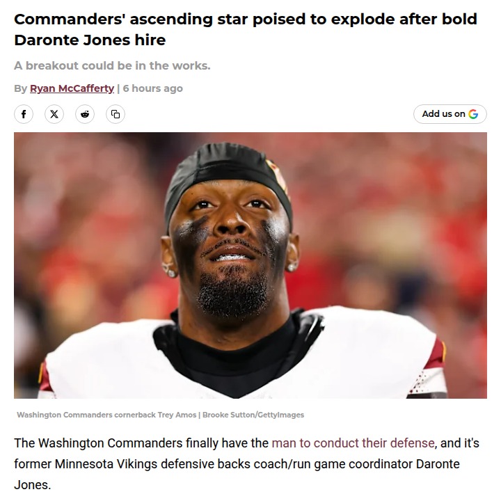 Jeffrey Armstrong+FollowCommanders D Gets a Needed Shake-UpDaronte Jones is already making waves as the new DC for the Commanders, targeting a major overhaul of the defensive front seven. After years of frustration under Joe Whitt Jr., fans finally get the aggressive changes they’ve been calling for. Jones is on the hunt for a coach who can revamp the pass rush and isn’t afraid to make tough calls—even if it means moving on from big names like Ken Norton Jr. or Ryan Kerrigan. This could be the fresh start the Burgundy & Gold need. #Sports #Football #Commanders00Share