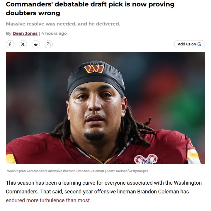 Jay Williams+FollowCommanders’ Brandon Coleman silences criticsBrandon Coleman’s journey with the Washington Commanders has been anything but smooth, but lately, he’s showing everyone why he deserves a spot on the field. After a tough start—switching positions, getting benched, and battling injuries—Coleman is now stepping up with a new level of grit and consistency. Even head coach Dan Quinn has noticed his growth, calling out his resilience and athleticism. With Coleman likely starting again in Week 18, it’s hard not to root for a guy who’s fighting to prove the doubters wrong. What do you think—has Coleman earned a bigger role next season? #Sports #Football #Commanders00Share