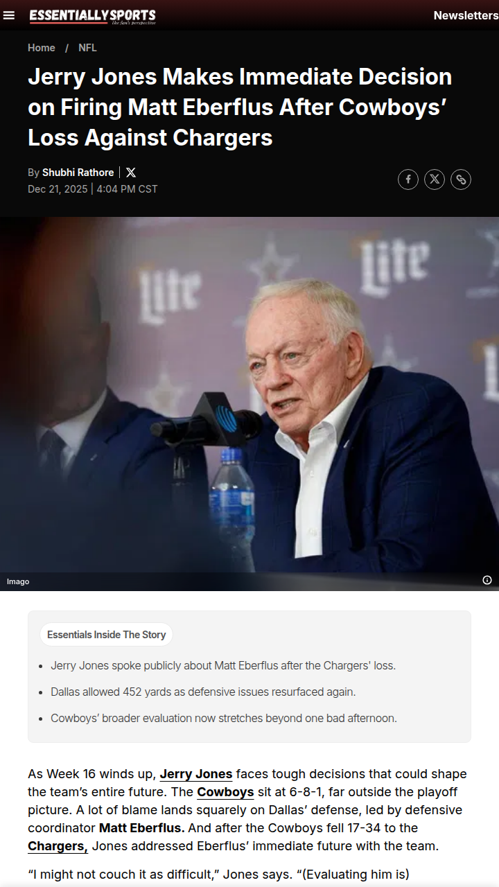 Michael Pitts+FollowCowboys fans react to Jerry Jones’ call on EberflusJerry Jones isn’t pulling the trigger on firing defensive coordinator Matt Eberflus, even after the Cowboys’ rough 17-34 loss to the Chargers. With Dallas sitting at 6-8-1 and playoff hopes dashed, fans are split: some want big changes, others agree with Jones that the blame falls on everyone, not just the defense. Jones insists the whole team underachieved this season. What do you think—should Eberflus stay, or is it time for a shakeup in Dallas? Let’s hear your take! #Sports #Football #CowboysNation11Share