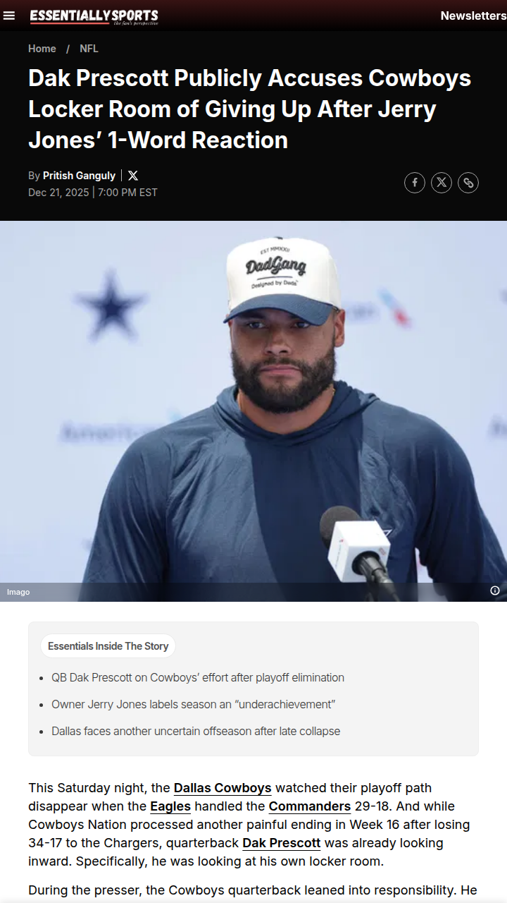 glen25+FollowCowboys locker room drama after Chargers lossDak Prescott isn’t holding back—he’s calling out his own teammates for giving up as the Cowboys’ playoff hopes vanished. After a rough 34-17 loss to the Chargers, Prescott’s frustration was clear: he questioned the effort and pride in the locker room, saying, “How could you cheat this game?” Owner Jerry Jones didn’t sugarcoat things either, summing up the season as “underachieved.” With three straight losses and another year missing the playoffs, fans are left wondering: is it time for big changes in Dallas? What do you think needs to happen next for the Cowboys? #Sports #Football #CowboysNation5981Share