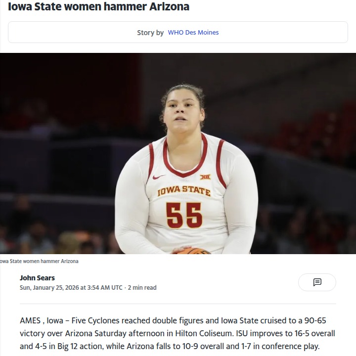 guerrajohn+FollowCyclones dominate Arizona in statement winIowa State women’s basketball just put on a show at Hilton Coliseum, steamrolling Arizona 90-65 with five Cyclones scoring in double digits. Jada Williams dropped 19 points against her former team, while Audi Crooks added 17, and together they shot an incredible 75% from the field. The Cyclones led nearly the entire game and notched their biggest halftime lead in conference play this season. Coach Bill Fennelly also tied the Big 12 record for most conference wins. What does this say about ISU’s momentum in the Big 12? Let’s talk about what’s clicking for the Cyclones right now! #Sports #Basketball #Cyclones00Share