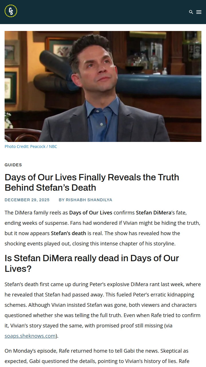 Ryan Massey+FollowStefan DiMera’s Death: Is Vivian Lying? 🤔Wild twist on Days of Our Lives! The show just confirmed Stefan DiMera’s death, but fans aren’t buying it. Vivian’s history of deception has everyone questioning if Stefan is really gone for good or if she’s hiding him somewhere. The tombstone photo and heart failure story seem a little too convenient—could this be another classic DiMera fake-out? The fandom is totally split! #Entertainment #TVSeries #DaysofOurLives61Share