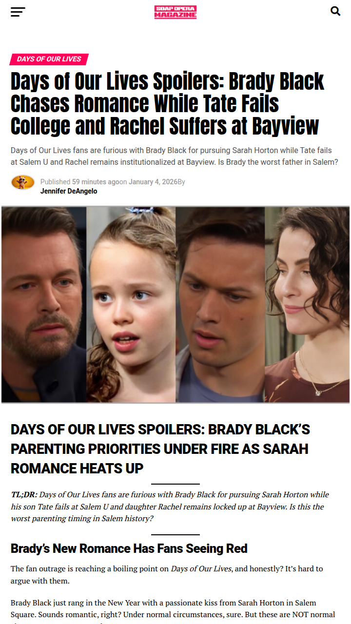 georgebryant+FollowBrady Black’s Romance Backlash 💔Brady Black is catching major heat from Days of Our Lives fans for cozying up to Sarah Horton while his family is in crisis. With Tate failing out of Salem U and Rachel still at Bayview, viewers are debating if this is the worst parenting move in Salem history. Is Brady’s timing for a new romance just plain selfish, or does he deserve a shot at happiness after all the Kristen drama? The fandom is seriously divided! #Entertainment #TVSeries #DaysOfOurLives30Share