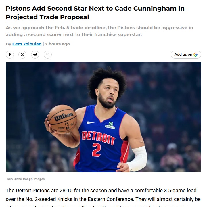 Nicole Obrien+FollowDetroit Pistons eye game-changing tradeDetroit’s playoff hopes could get a major boost if the Pistons pull off a trade for Michael Porter Jr. With Cade Cunningham already leading the charge, adding one of the league’s most efficient sharpshooters would finally give Detroit the offensive punch they’ve been missing. Porter Jr. is averaging over 25 points a game and hitting nearly 40% from deep—exactly the kind of firepower that could turn the Pistons from playoff hopefuls into real contenders. Would you trade Tobias Harris and future picks for MPJ, or stick with the current squad? Let’s hear your take! #Sports #Basketball #DetroitPistons00Share